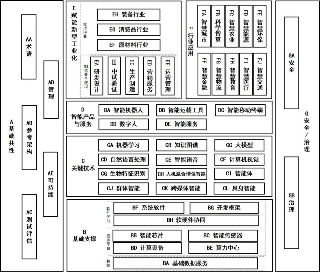 基础共性标准主要包括人工智能术语、参考架构、测试评估、管理、可持续等标准。1. 术语标准。规范人工智能相关技术、应用的概念定义,为其它标准的制定和人工智能研究提供参考,包括人工智能相关术语定义、范畴、实例等标准。2. 参考架构标准。规范人工智能相关技术、应用及系统的逻辑关系和相互作用,包括人工智能参考架构、人工智能系统生命周期及利益相关方等标准。3. 测试评估标准。规范人工智能技术发展的成熟度、人工智能体系架构之间的适配度、行业发展水平、企业智能化能力等方面的测试及评估的指标要求,包括与人工智能相关的服务能力成熟度评估,人工智能通用性测试指南、评估原则和等级要求,企业智能化能力框架及测评要求等标准。4. 管理标准。规范人工智能技术、产品、系统、服务等全生命周期涉及的人员、组织管理要求和评价,包括面向人工智能组织的管理要求,人工智能管理体系、分类方法、评级流程等标准。5. 可持续标准。规范人工智能影响环境的技术框架、方法和指标,平衡产业发展与环境保护,包括促进生态可持续的人工智能软件开源基础框架,人工智能系统能效评价,人工智能与资源利用、碳排放、废弃部件处置等标准。基础支撑标准主要包括基础数据服务、智能芯片、智能传感器、计算设备、算力中心、系统软件、开发框架、软硬件协同等标准。1. 基础数据服务标准。规范人工智能研发、测试、应用等过程中涉及数据服务的要求,包括数据采集、数据标注、数据治理、数据质量等标准。2. 智能芯片标准。规范智能芯片相关的通用技术要求,包括智能芯片架构、指令集、统一编程接口及相关测试要求、芯片数据格式和协议等标准。3. 智能传感器标准。规范单模态、多模态新型传感器的接口协议、性能评定、试验方法等技术要求,包括智能传感器的架构、指令、数据格式、信息提取方法、信息融合方法、功能集成方法、性能指标和评价方法等标准。4. 计算设备标准。规范人工智能加速卡、人工智能加速模组、人工智能服务器等计算设备,及使能软件的技术要求和测试方法,包括人工智能计算设备虚拟化方法,人工智能加速模组接口协议和测试方法,及使能软件的访问协议、功能、性能、能效的测试方法和运行维护要求等标准。5. 算力中心标准。规范面向人工智能的大规模计算集群、新型数据中心、智算中心、基础网络通信、算力网络、数据存储等基础设施的技术要求和评估方法,包括基础设施参考架构、计算能力评估、技术要求、稳定性要求和业务服务接口等标准。6. 系统软件标准。规范人工智能系统层的软硬件技术要求,包括软硬件编译器架构和优化方法、人工智能算子库、芯片软件运行时库及调试工具、人工智能软硬件平台计算性能等标准。7. 开发框架标准。规范人工智能开发框架相关的技术要求,包括开发框架的功能要求,与应用系统之间的接口协议、神经网络模型表达和压缩等标准。8. 软硬件协同标准。规范智能芯片、计算设备等硬件与系统软件、开发框架等软件之间的适配要求,包括智能芯片与开发框架的适配要求、人工智能计算任务调度、分布式计算等软硬件协同任务的交互协议、执行效率和协同性能等标准。关键技术标准主要包括机器学习、知识图谱、大模型、自然语言处理、智能语音、计算机视觉、生物特征识别、人机混合增强智能、智能体、群体智能、跨媒体智能、具身智能等标准。1. 机器学习标准。规范机器学习的训练数据、数据预处理、模型表达和格式、模型效果评价等,包括自监督学习、无监督学习、半监督学习、深度学习、强化学习等标准。2. 知识图谱标准。规范知识图谱的描述、构建、运维、共享、管理和应用,包括知识表示与建模、知识获取与存储、知识融合与可视化、知识计算与管理、知识图谱质量评价与互联互通、知识图谱交付与应用、知识图谱系统架构与性能要求等标准。3. 大模型标准。规范大模型训练、推理、部署等环节的技术要求,包括大模型通用技术要求、评测指标与方法、服务能力成熟度评估、生成内容评价等标准。4. 自然语言处理标准。规范自然语言处理中语言信息提取、文本处理、语义处理等方面的技术要求和评测方法,包括语法分析、语义理解、语义表达、机器翻译、自动摘要、自动问答、语言大模型等标准。5. 智能语音标准。规范前端处理、语音处理、语音接口、数据资源等技术要求和评测方法,包括深度合成的鉴伪方法、全双工交互、语音大模型等标准。6. 计算机视觉标准。规范图像获取、图像/视频处理、图像内容分析、三维计算机视觉、计算摄影学、跨媒体融合等技术要求和评价方法,包括功能、性能、可维护性等标准。7. 生物特征识别标准。规范生物特征样本处理、生物特征数据协议、设备或系统等技术要求,包括生物特征数据交换格式、接口协议等标准。8. 人机混合增强智能标准。规范多通道、多模式和多维度的交互途径、模式、方法和技术要求,包括脑机接口、在线知识演化、动态自适应、动态识别、人机协同感知、人机协同决策与控制等标准。9. 智能体标准。规范以通用大模型为核心的智能体实例和智能体基本功能、应用架构等技术要求,包括智能体强化学习、多任务分解、推理