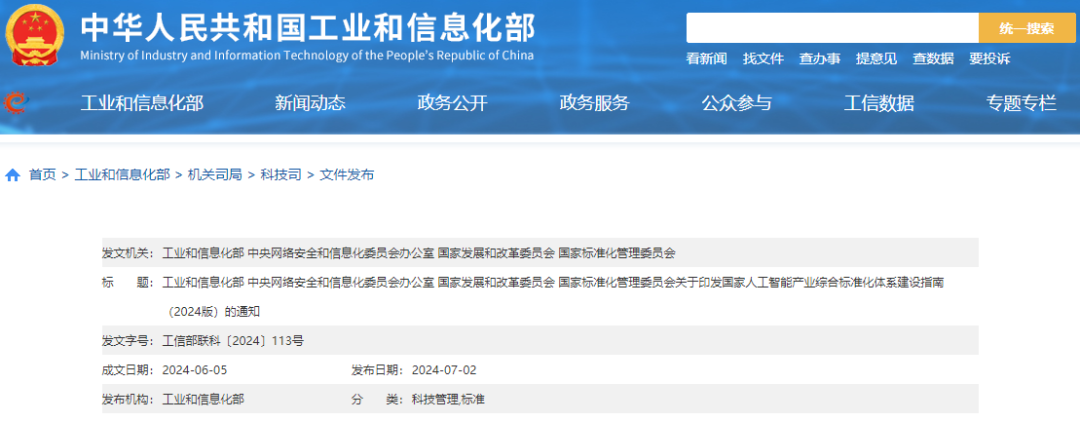 各省、自治区、直辖市及新疆生产建设兵团工业和信息化主管部门、网信办、发展改革委、市场监管局(厅、委),有关行业协会、标准化技术组织、标准化专业机构:为深入贯彻落实党中央、国务院决策部署,加强人工智能标准化工作系统谋划,工业和信息化部、中央网络安全和信息化委员会办公室、国家发展和改革委员会、国家标准化管理委员会组织编制了《国家人工智能产业综合标准化体系建设指南(2024版)》。现印发给你们,请结合实际,抓好贯彻落实。