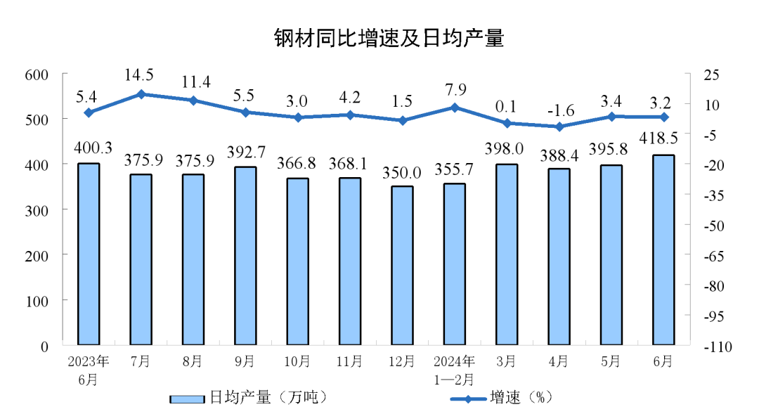 据国家统计局公布的数据,2024年6月份,我国粗钢产量9161万吨,同比增长0.2%;生铁产量7449万吨,同比下降3.3%;钢材产量12555万吨,同比增长3.2%。