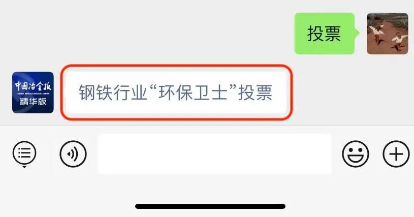 2.点击左下角对话框,输入“投票”,即可跳出钢铁行业“环保卫士”投票,点击进入链接投票。