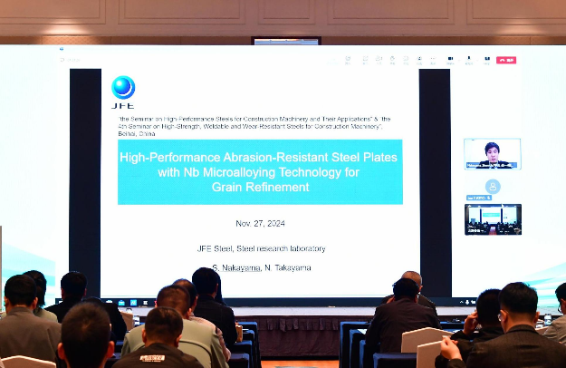 图为日本JFE Nakayama 做《铌微合金化高性能耐磨钢板组织细化控制技术》报告 |
